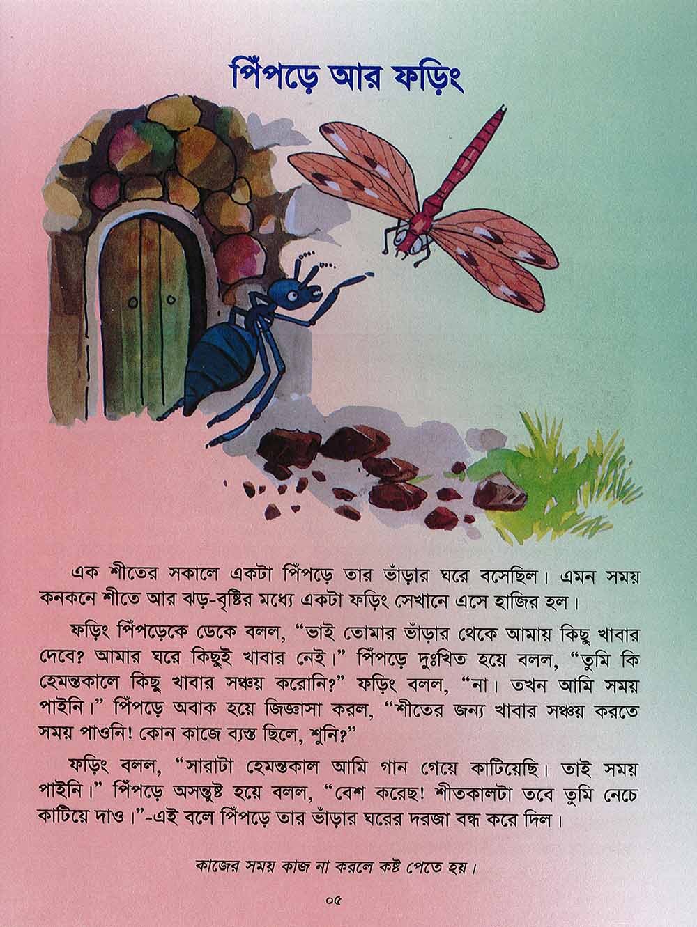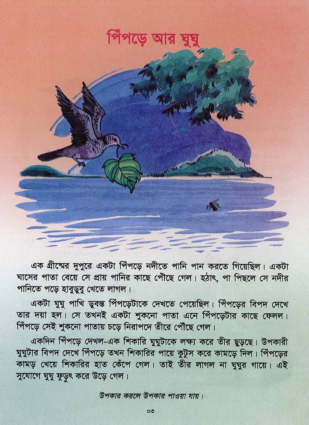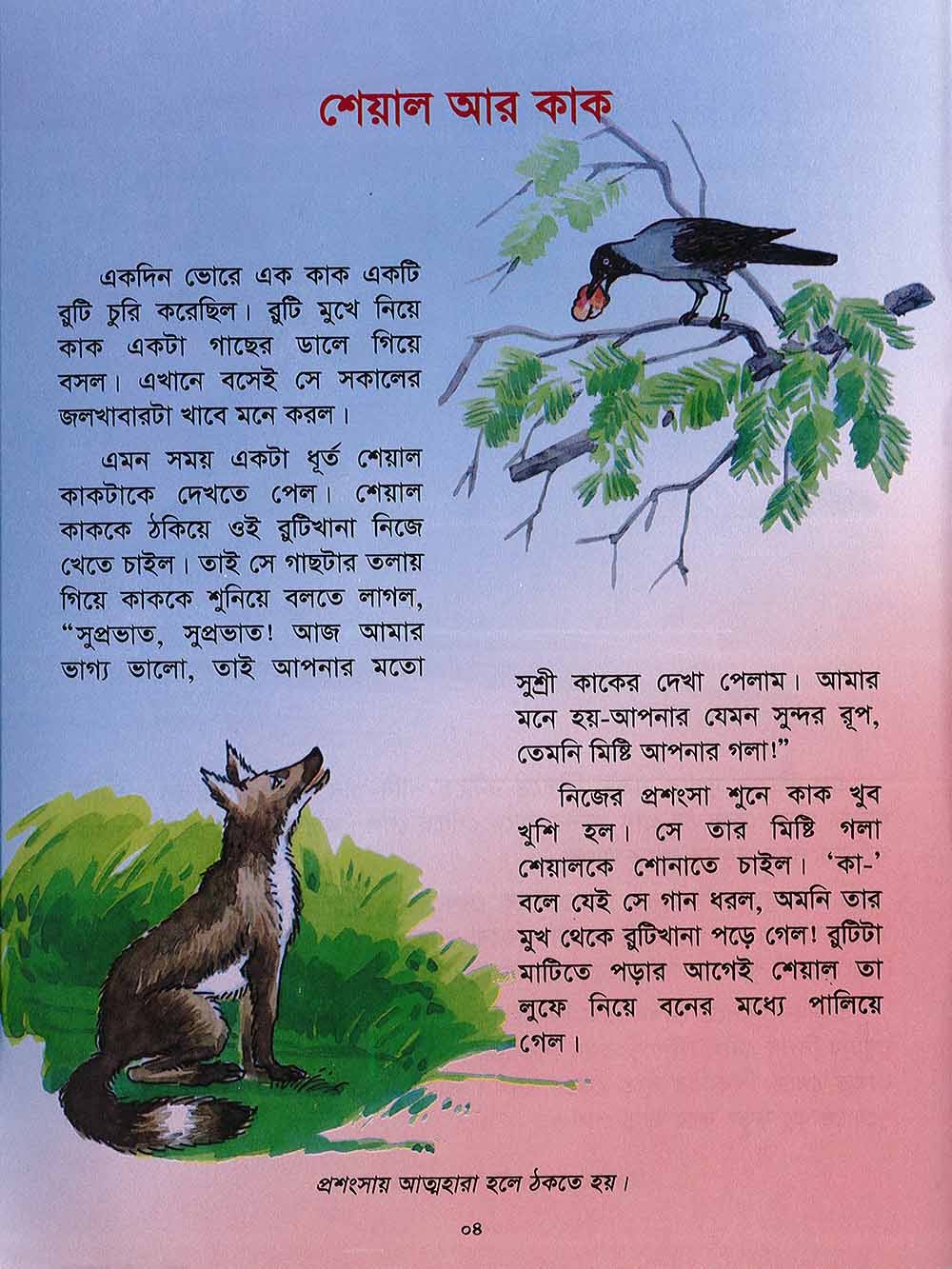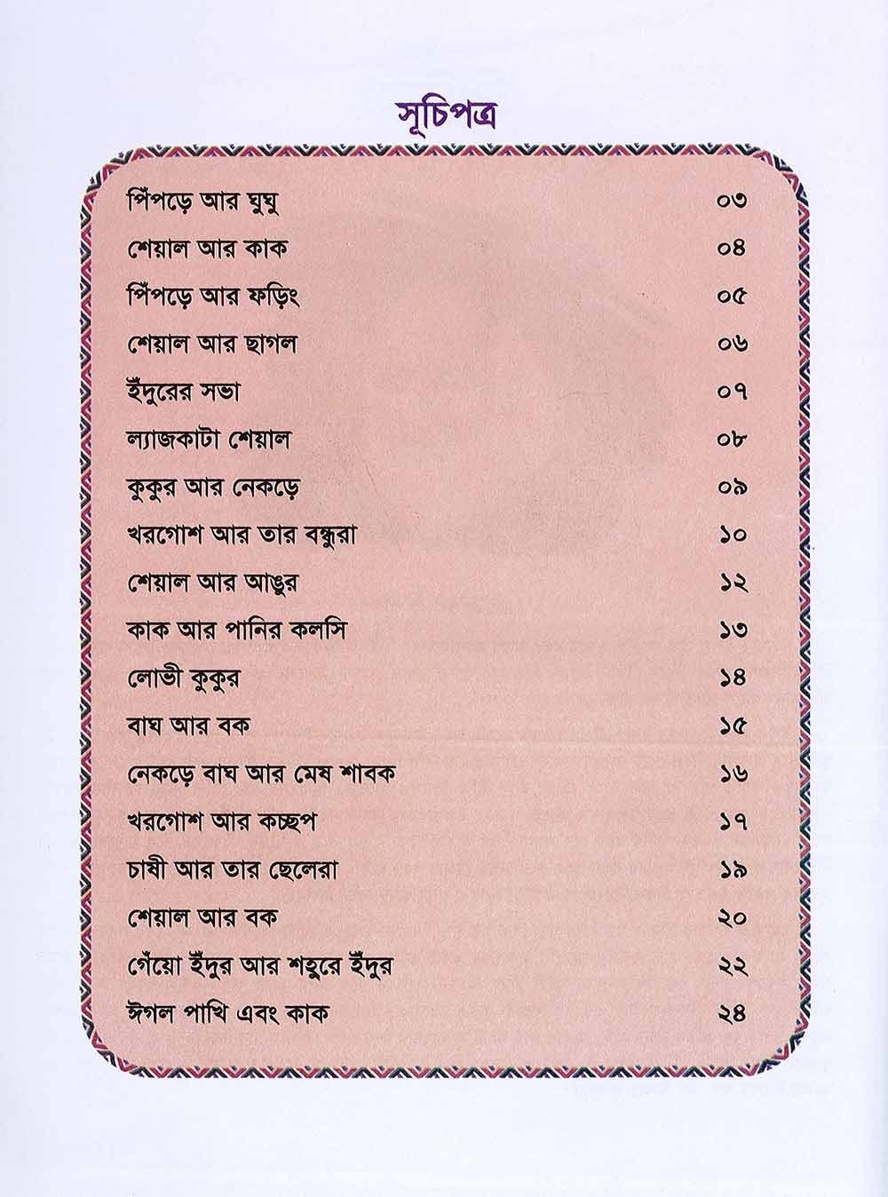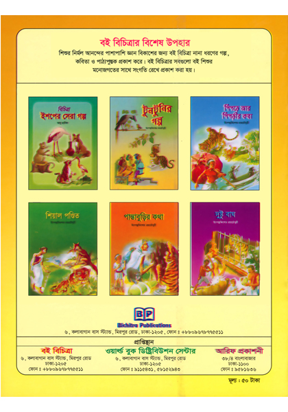 “Bichitra Shisuder Galper Juli”, a book of story for the children is written with a view to rendering fresh delight to the tiny tots. The children want to listen to the stories of different types from their parents and also their grandfathers and mothers. At this, the elderly persons start telling stories. As soon as they hear stories from them, they become at once very attentive to them. They become overwhelmed with eagerness, their eyes blink with the rays of merriment. Their heart lips up with pure delight, this change is quite noticeable in the impatient children when they sit to hear stories from the Elders. They insist on them telling the same story again and again. Even though they grow old they read the same story time and again. This very eagerness of the children to hear stories inspires us to publish this "Bichitra stories for children”. This is a series of seven books. There are good number of stories here. We do hope these stories will give them delight. Most of the stories of this book are taken from the ‘Aeshop’s Fables’, Hilopadesh’. Every story is so beautiful along with the colourful pictures that all of them are bound to be enchanted by them. The stories are patterned keeping in view the likings as well as the understanding power of the children. Almost every story ends with a moral.