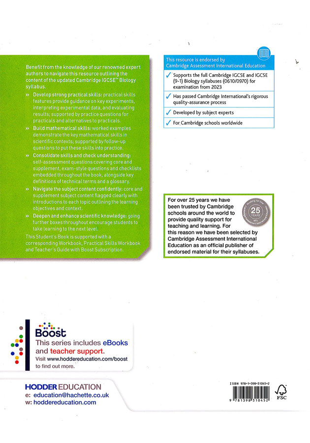 This title is endorsed by Cambridge Assessment International Education to support the full syllabus for examination from 2023. Written by renowned expert authors, our updated resources enable the learner to effectively navigate through the content of the updated Cambridge IGCSE™ Biology (0610/0970) syllabus for examination from 2023.