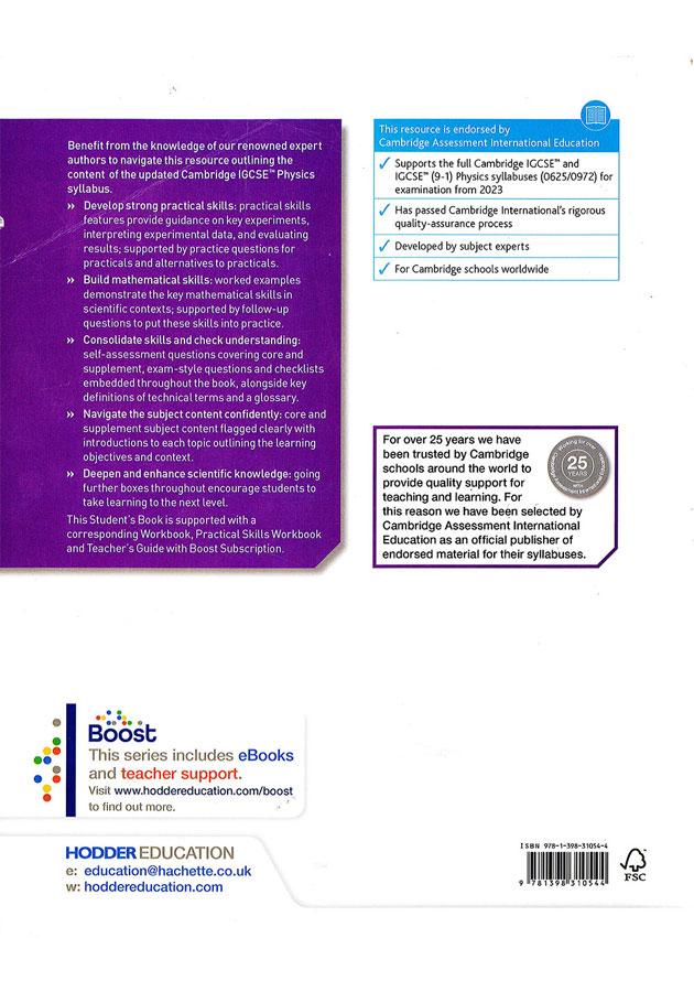 This title is endorsed by Cambridge Assessment International Education to support the full syllabus for examination from 2023. Written by renowned expert authors, our updated resources enable the learner to effectively navigate through the content of the updated Cambridge IGCSE™ Physics (0625/0972) syllabus for examination from 2023.