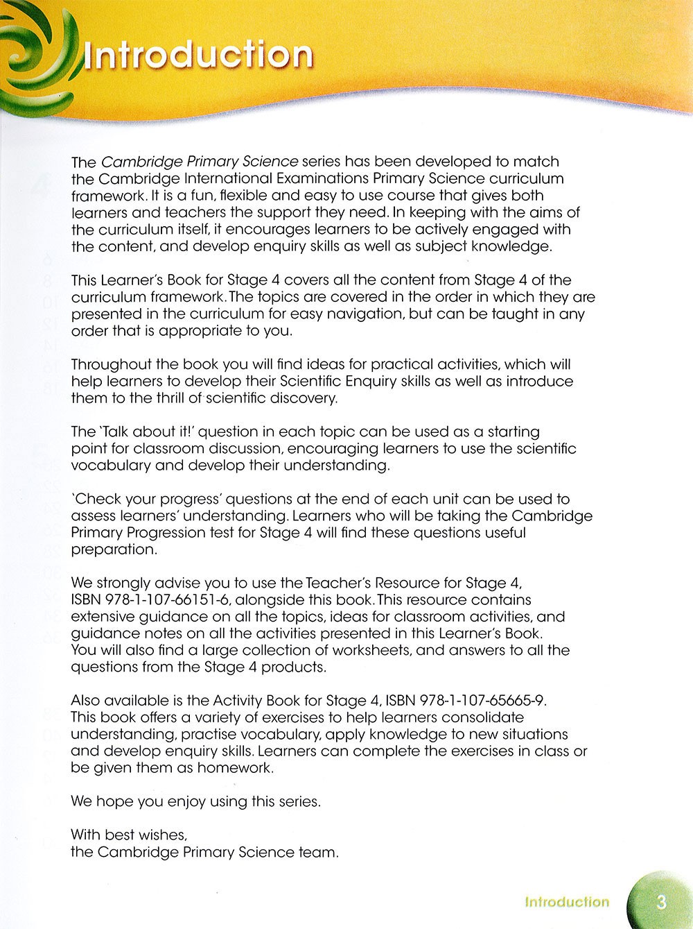 Cambridge Primary Science is a flexible, engaging course written specifically for the Cambridge Primary Science curriculum framework. This Learner's Book for Stage 4 covers all objectives required by the curriculum framework in an engaging, visually stimulating manner. Learning through enquiry is supported by suggestions for hands-on activities, which provide integrated coverage of the Scientific Enquiry objectives. Language skills can be developed using the 'Talk about it!' ideas for classroom discussion. Assessment and preparation for the Progression Test is achieved through 'Check your progress' questions at the end of each unit.