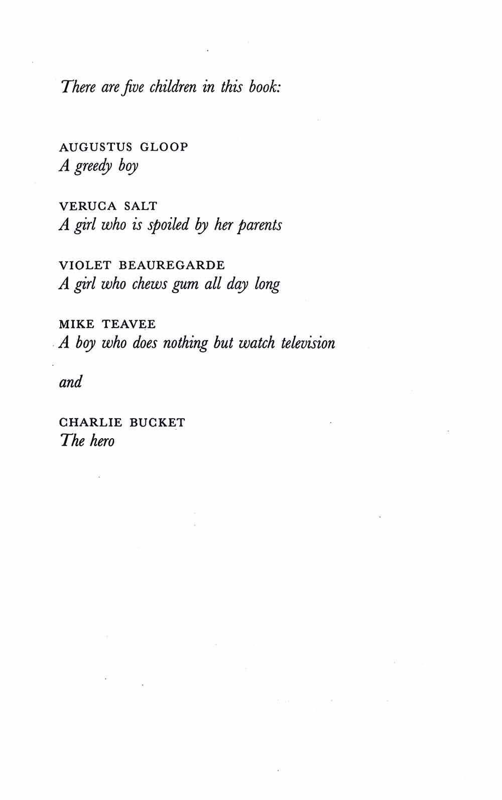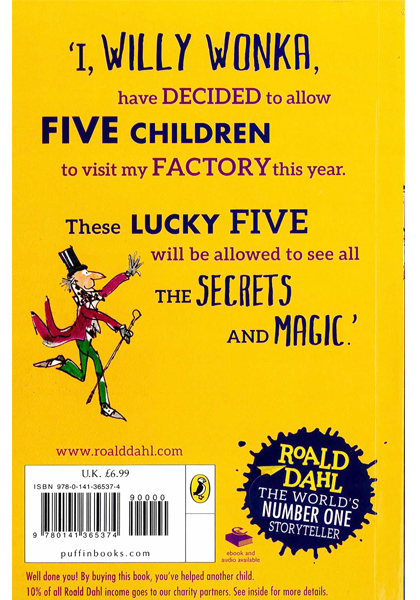 Mr Willy Wonka is the most extraordinary chocolate maker in the world.And do you know who Charlie is? Charlie Bucket is the hero. The other children in this book are nasty little beasts, called: Augustus Gloop - a great big greedy nincompoop; Veruca Salt - a spoiled brat; Violet Beauregarde - a repulsive little gum-chewer; Mike Teavee - a boy who only watches television.Clutching their Golden Tickets, they arrive at Wonka's chocolate factory. But what mysterious secrets will they discover? Our tour is about to begin. Please don't wander off. Mr Wonka wouldn't like to lose any of you at this stage of the proceedings . . .