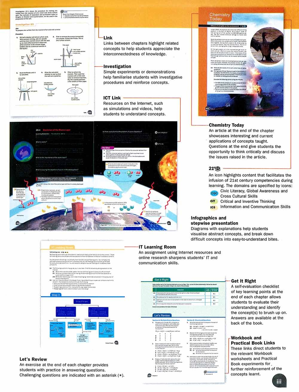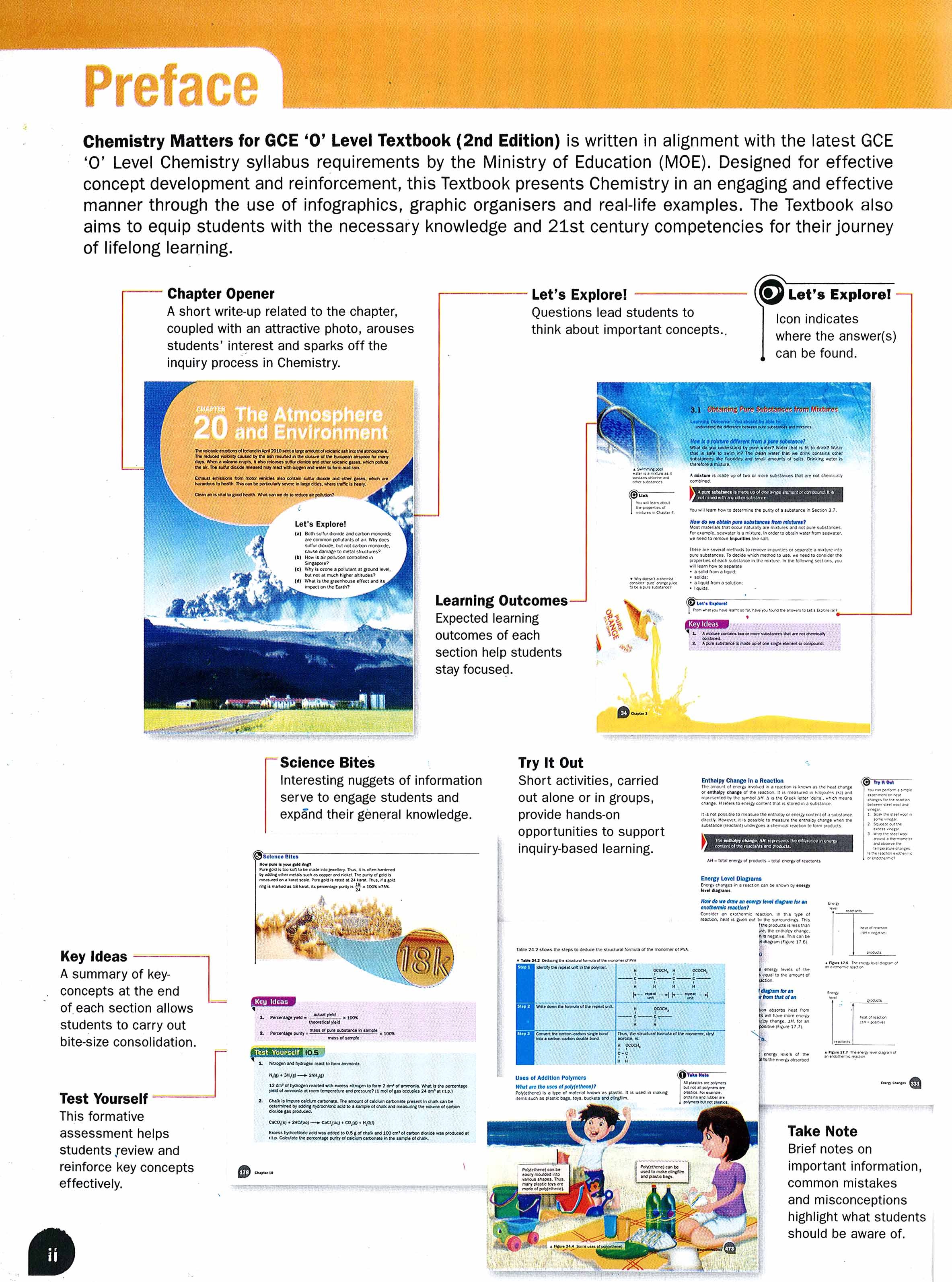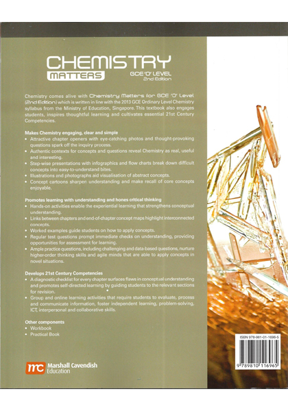 "Chemistry Matters textbook is written in alignment with the latest GCE Ordinary Level Chemistry syllabus by the Ministry of Education, Singapore. ... Makes Chemistry engaging, clear and simple - Captivating chapter openers with attractive photos and though-provoking questions spark off the inquiry process. - Concepts presented within authentic contexts make Physics relevant, useful and interesting. - Step-wise presentations with infographics and flow charts break down difficult concepts into easy-to-understand bites. - Illustrations and photographs and visualisation of abstract concepts. Links to online animations and videos provides dynamic visual learning support. Promotes learning with understanding and hones critical thinking - Hands-on activities enable the experiential learning that strengthens conceptual understanding. - Links between chapters and end-of-chapter concept maps highlight interconnected concepts. - Worked examples guide students on how to apply concepts. - Regular test questions prompt immediate checks on understanding, providing opportunities for assessment for learning. - Ample practice questions, including challenging and data-based questions, nurture higher-order thinking skills and agile minds that are able to apply concepts on novel situations. Develops 21st century competencies - A diagnostic checklist for every chapter surfaces flaws in conceptual understanding and promotes self-directed learning by guiding students to the relevant sections for revision. - Group and online learning activities that require students to evaluate, process and communicate information, foster independent learning, problem-solving, ICT, interpersonal and collaborative skills.