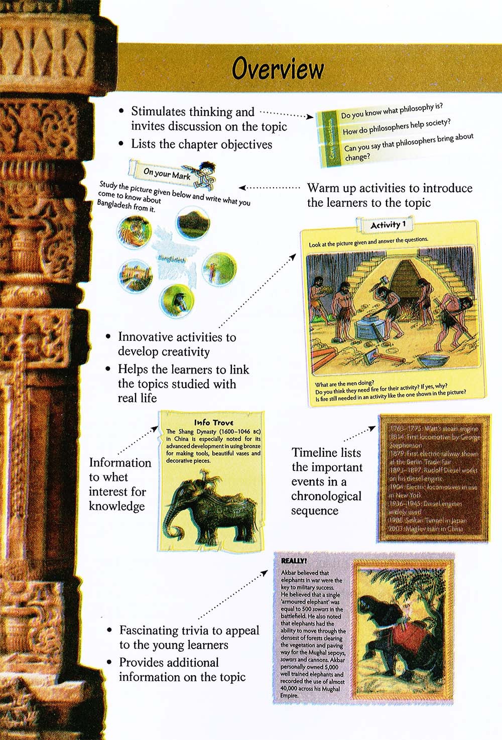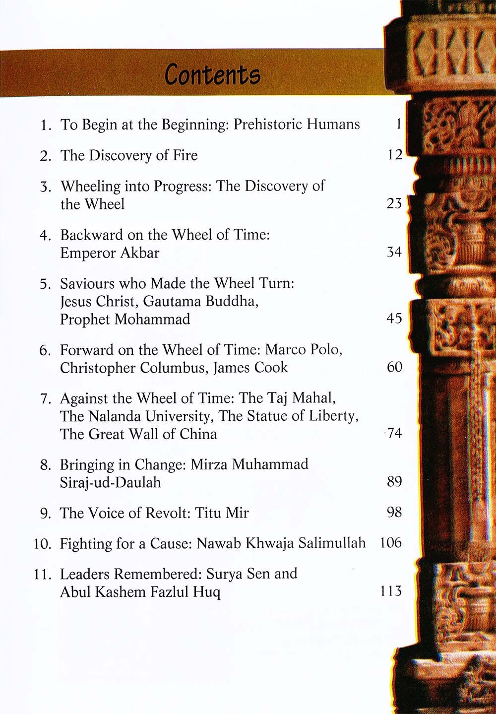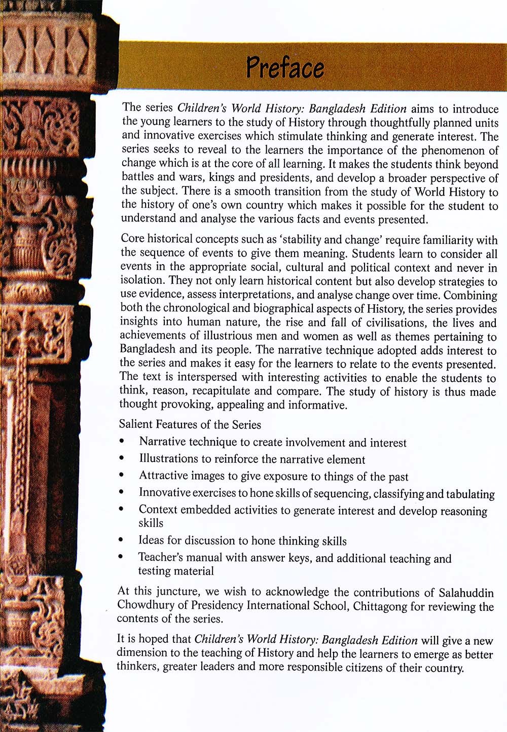The series Children's World History: Bangladesh History brings to the learners the importance of the phenomenon of change which is at the core of all learning and stimulates them to think beyond battles and wars, kings and presidents and develop a broader perspective of the subject. There is a smooth transition from a study of World History to the history of one's own country which makes it possible for the young learner to know, to understand, and to analyse the various facts and events presented. The series provides glimpses into the rise and fall of civilizations in the world, gives a brief description of men and women who have stood the test of Time and made a mark in History and chronicles the formation, the development and the progress of Bangladesh and its people.