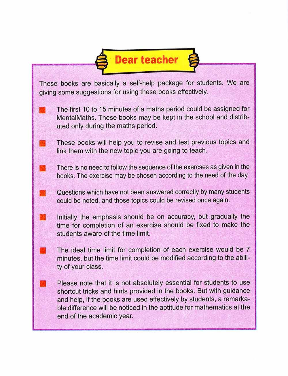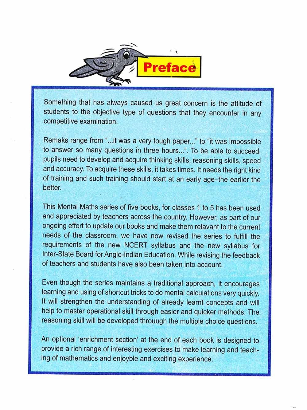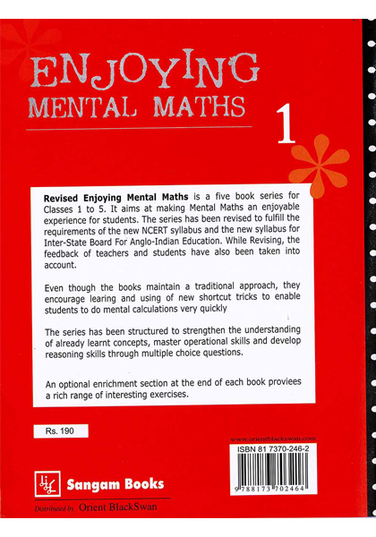 Revised Enjoying Mental Maths is a five-book series for Classes 1 to 5. It aims at making Mental Maths an enjoyable experience for students. The series has been revised to fulfil the requirements of the new NCERT syllabus and the new syllabus for Inter-State Board For Anglo-Indian Education. While revising the feedback of teachers and students have also been taken into account. Even though the book maintains a traditional approach, they encourage learning and using of new shortcut tricks to enable students to do mental calculations very quickly. The series has been structured to strengthen the understanding of already learnt concepts, master operational skills and develop reasoning skills through multiple-choice questions. An optional enrichment section at the end of each book provides a rich range of interesting exercises.
