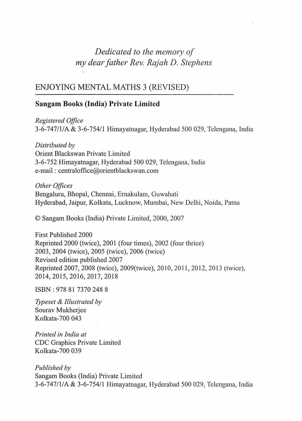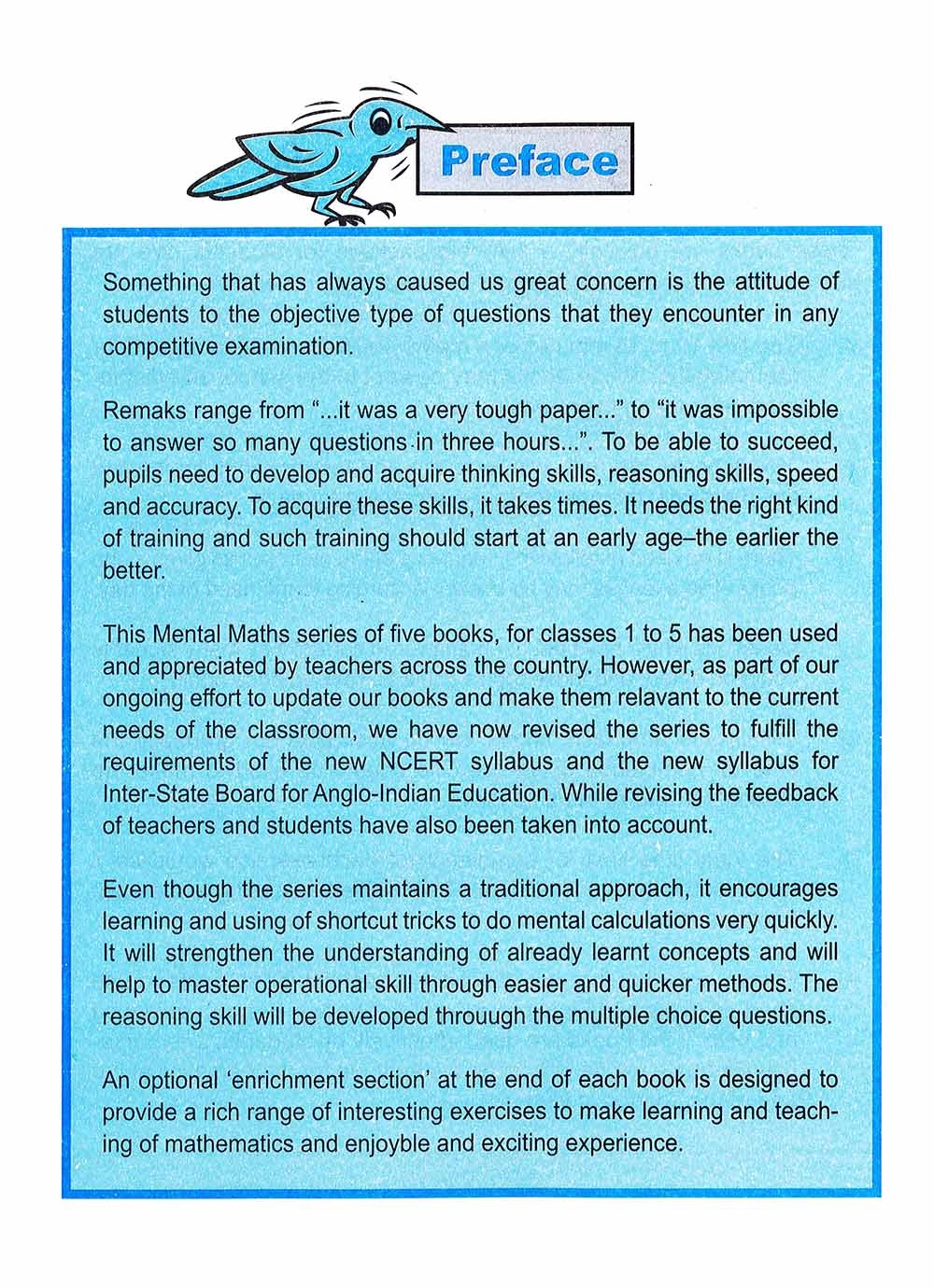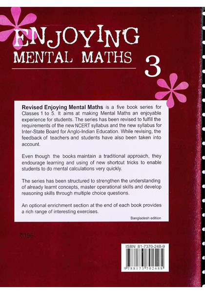 Revised Enjoying Mental Maths is a five-book series for Classes 1 to 5. It aims at making Mental Maths an enjoyable experience for students. The series has been revised to fulfil the requirements of the new NCERT syllabus and the new syllabus for Inter-State Board For Anglo-Indian Education. While revising the feedback of teachers and students have also been taken into account.