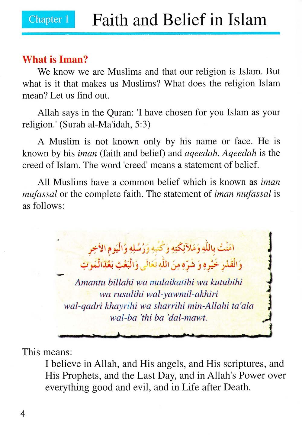 This course has been designed to present the young students a comprehensive Islamic education, comprising general Islamic knowledge based on the Quran and Hadith. Instead of teaching moral principles directly, they are taught through themes chosen from the Quran and other Islamic sources. Though basically intended for use as a school textbook, is also an ideal tool for home schooling involving both parents and children.