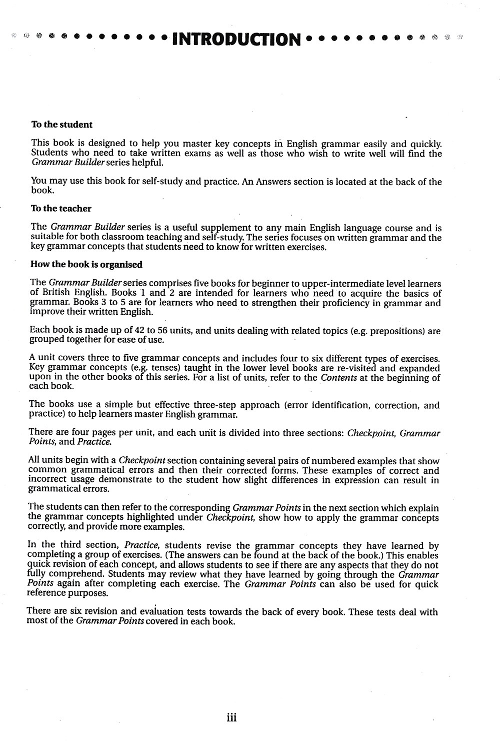 The Grammar Builder series comprises five books for beginner to upper-intermediate level learners of British English. The books are designed to help learners master key concepts in English grammar easily and quickly. Students who need to take written exams as well as anyone who wishes to write well wll find the books useful.