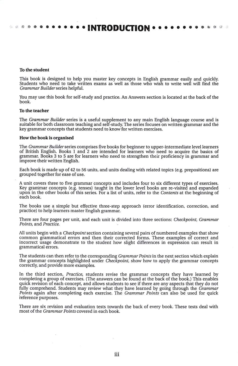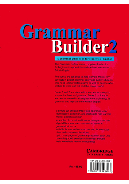 The Grammar Builder series comprises five books for beginner to upper-intermediate level learners of British English. The books are designed to help learners master key concepts in English grammar easily and quickly. Students who need to take written exams as well as anyone who wishes to write well wll find the books useful.