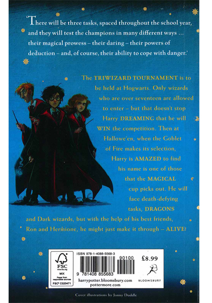 The Triwizard Tournament is to be held at Hogwarts. Only wizards who are over seventeen are allowed to enter - but that doesn't stop Harry dreaming that he will win the competition. Then at Hallowe'en, when the Goblet of Fire makes its selection, Harry is amazed to find his name is one of those that the magical cup picks out. He will face death-defying tasks, dragons and Dark wizards, but with the help of his best friends, Ron and Hermione, he might just make it through - alive! These new editions of the classic and internationally bestselling, multi-award-winning series feature instantly pick-up-able new jackets by Jonny Duddle, with huge child appeal, to bring Harry Potter to the next generation of readers. It's time to PASS THE MAGIC ON .