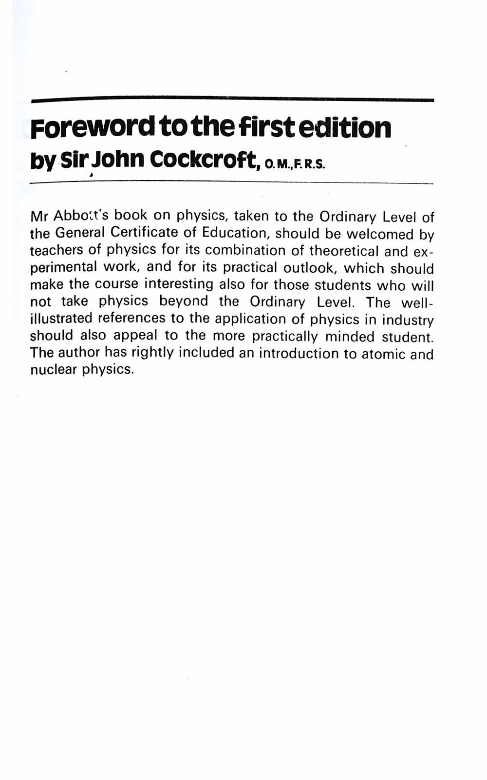 Abbott’s popular book provides comprehensive coverage of Physics syllabus for pupils aged 16+ including GCSE in schools and colleges. The requirements of the West African Examinations Council, the Hong Kong School Certificate, the East African Examinations Council and Singapore Ministry of Education have also been taken into consideration. Semiconductor devices and other applications are becoming increasingly important in Physics courses at this level. To reflect this, the fifth edition includes a substantial amount of new material on logic gates and their uses. Physics provides a stimulating course companion for students taking examinations at this level and a firm foundation for the future studies of physics and engineers.