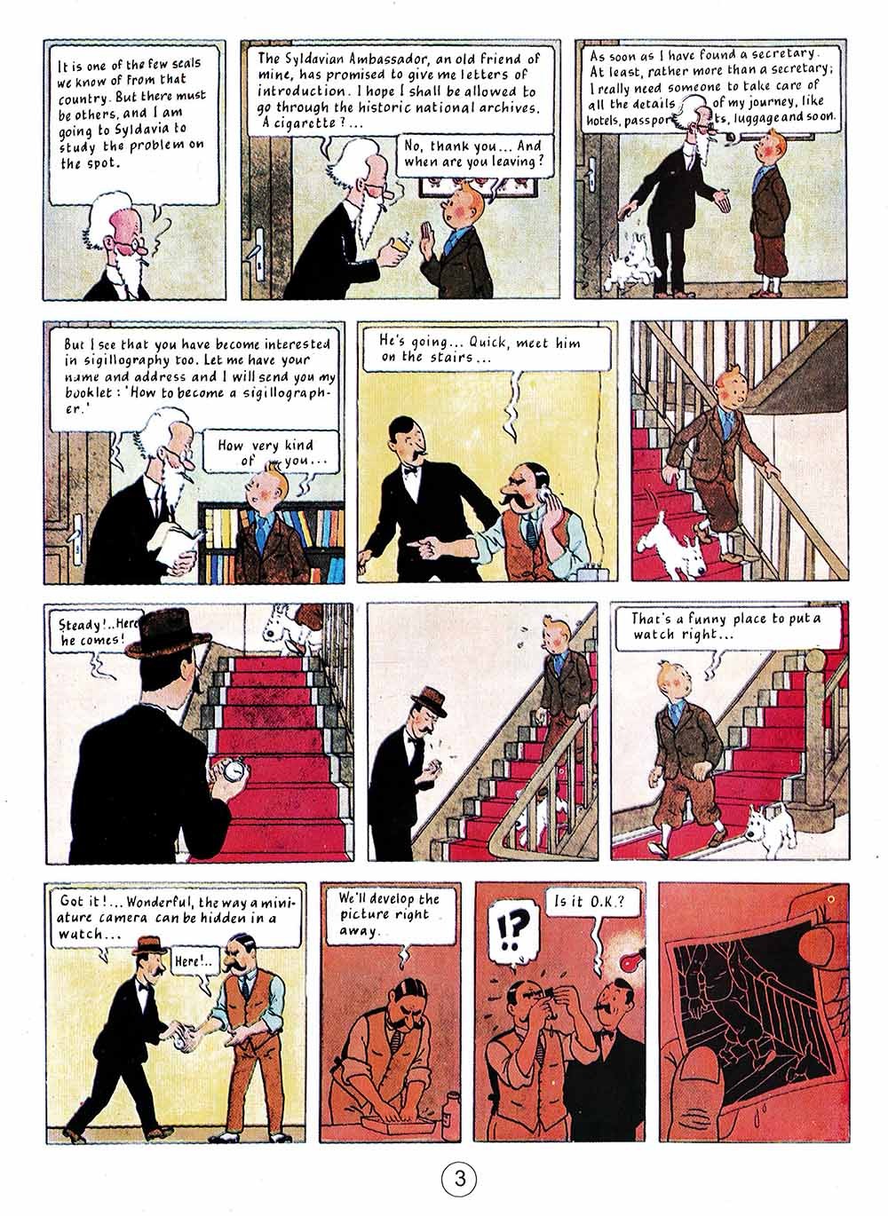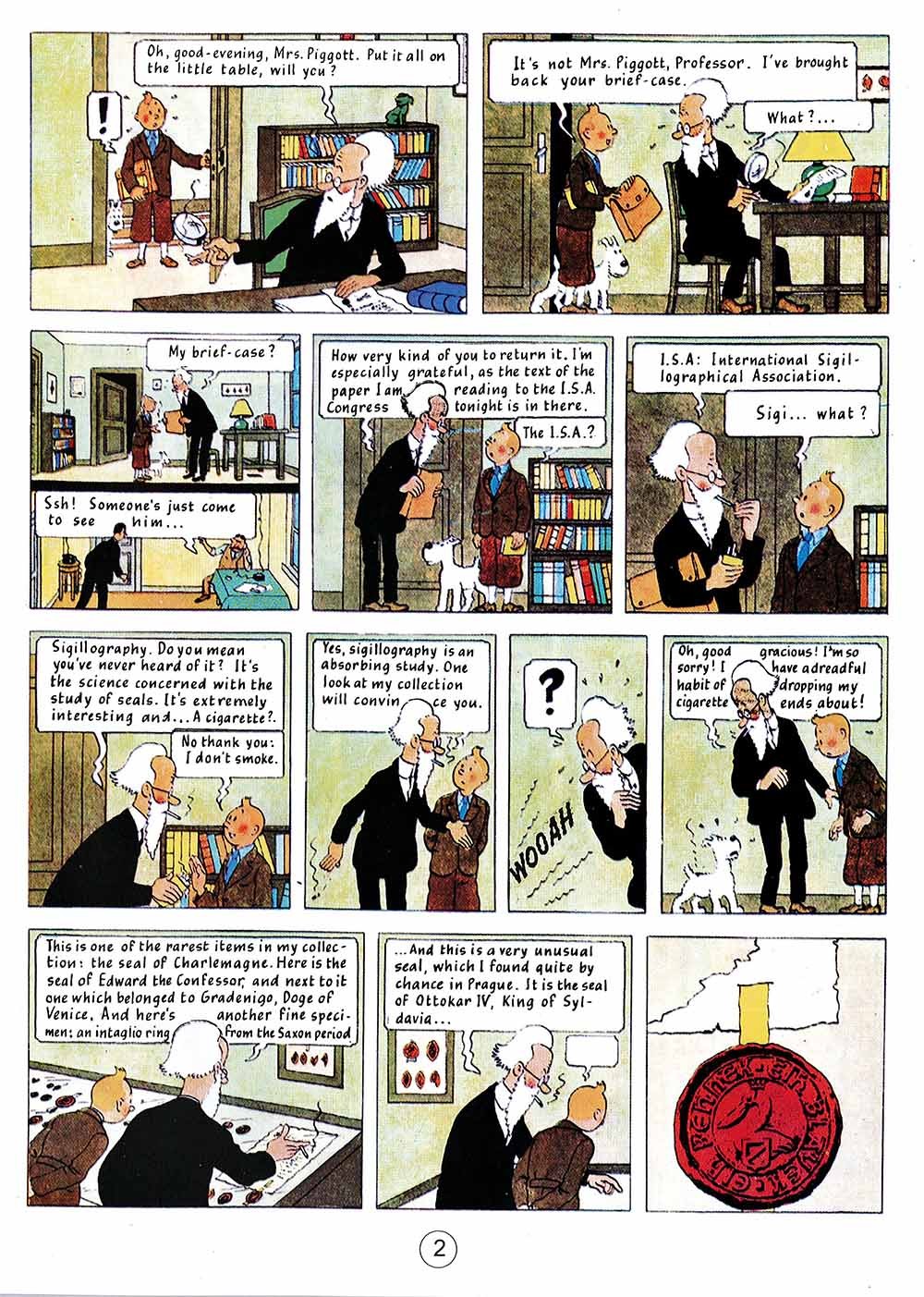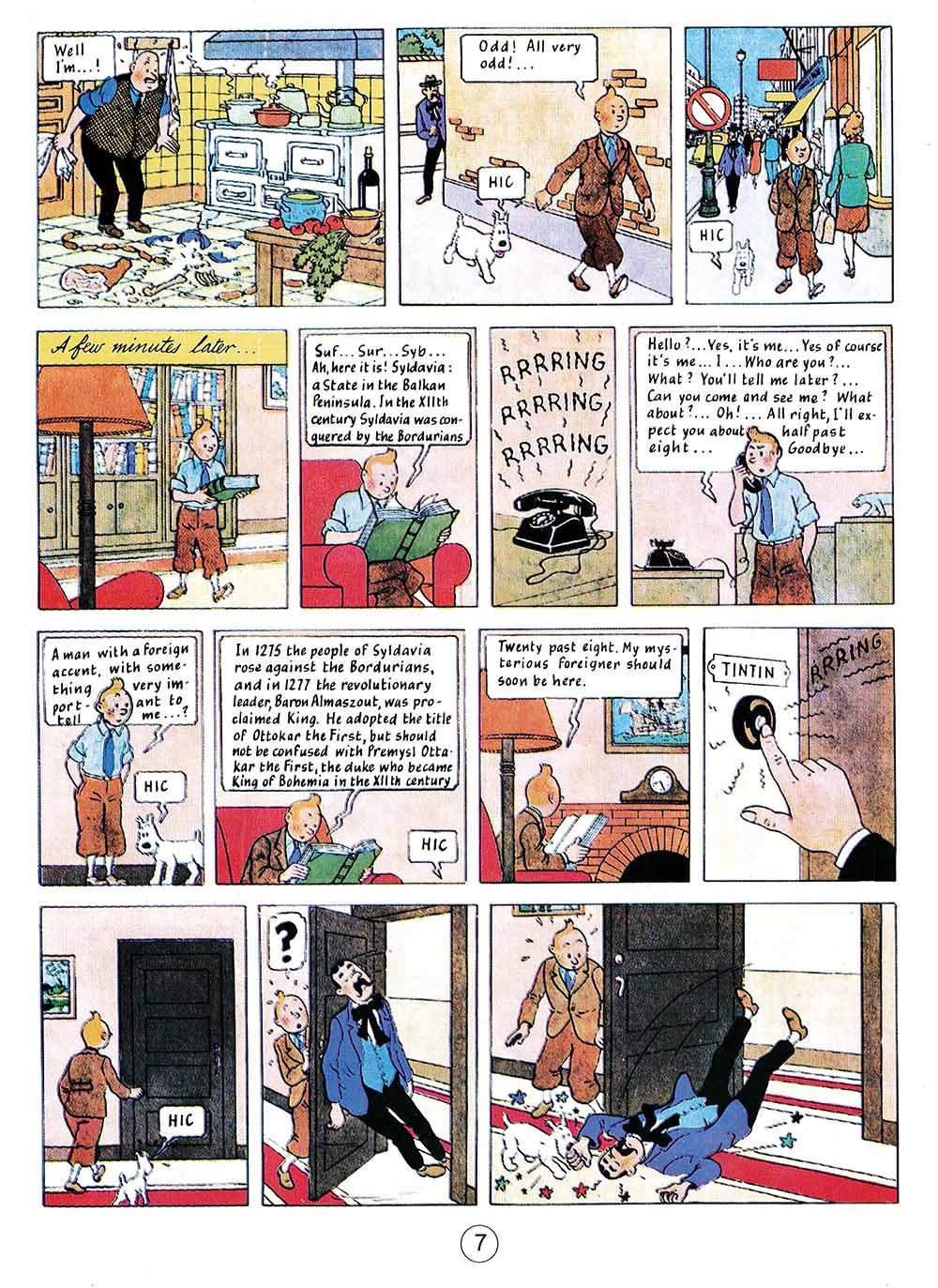 King Ottokar's Sceptre Created in 1939, this book is most impressive and has its sights on Germany. Tintin finds a brief-case on a park bench and this leads him to Prague, then to Syldavia. He will save the Kingdom from being overthrown by a fascist "coup d'état".