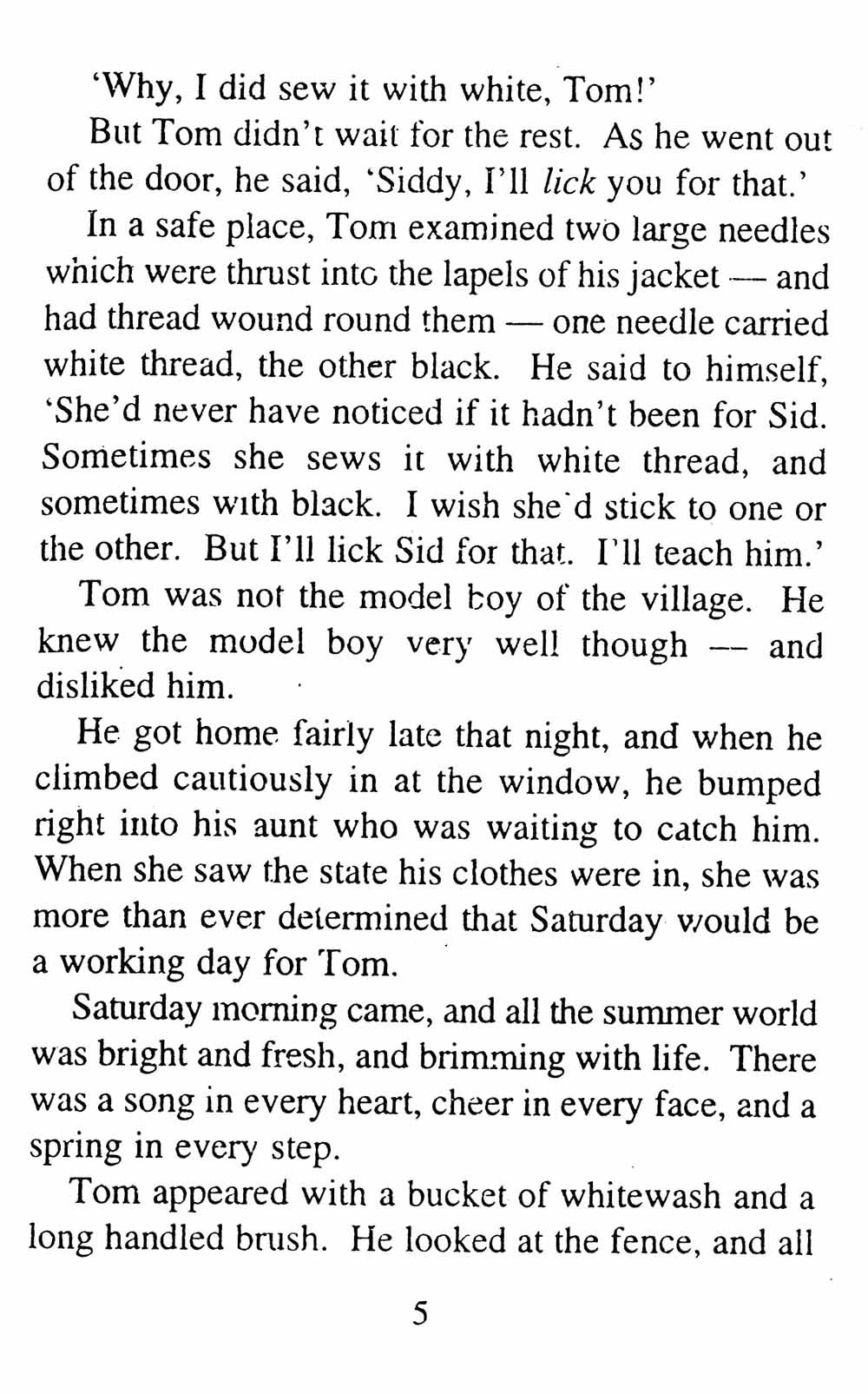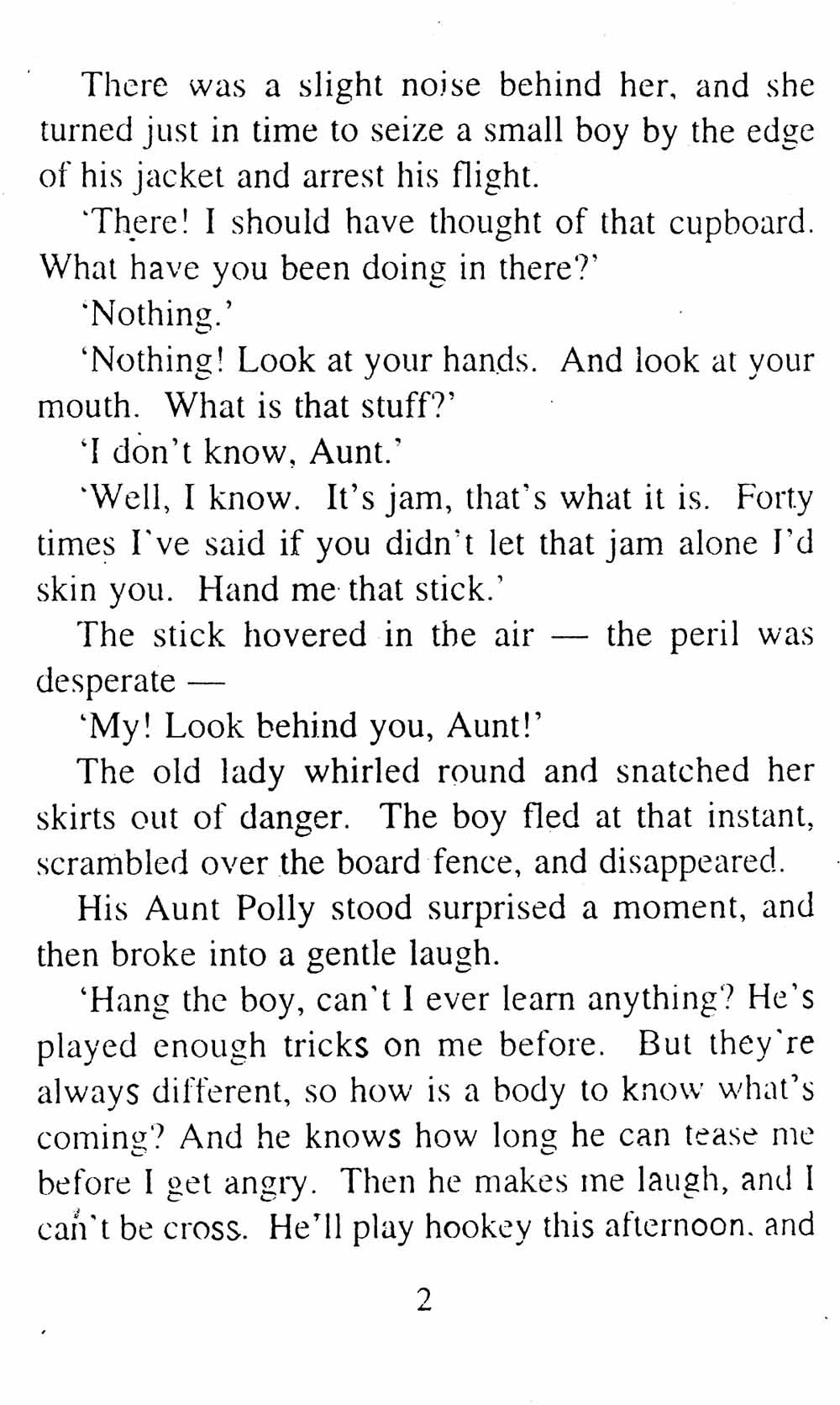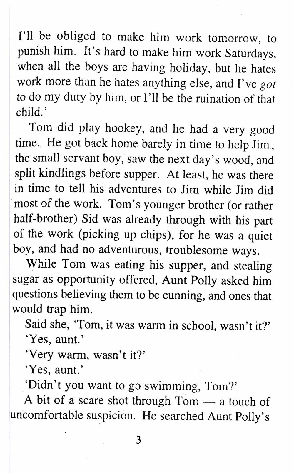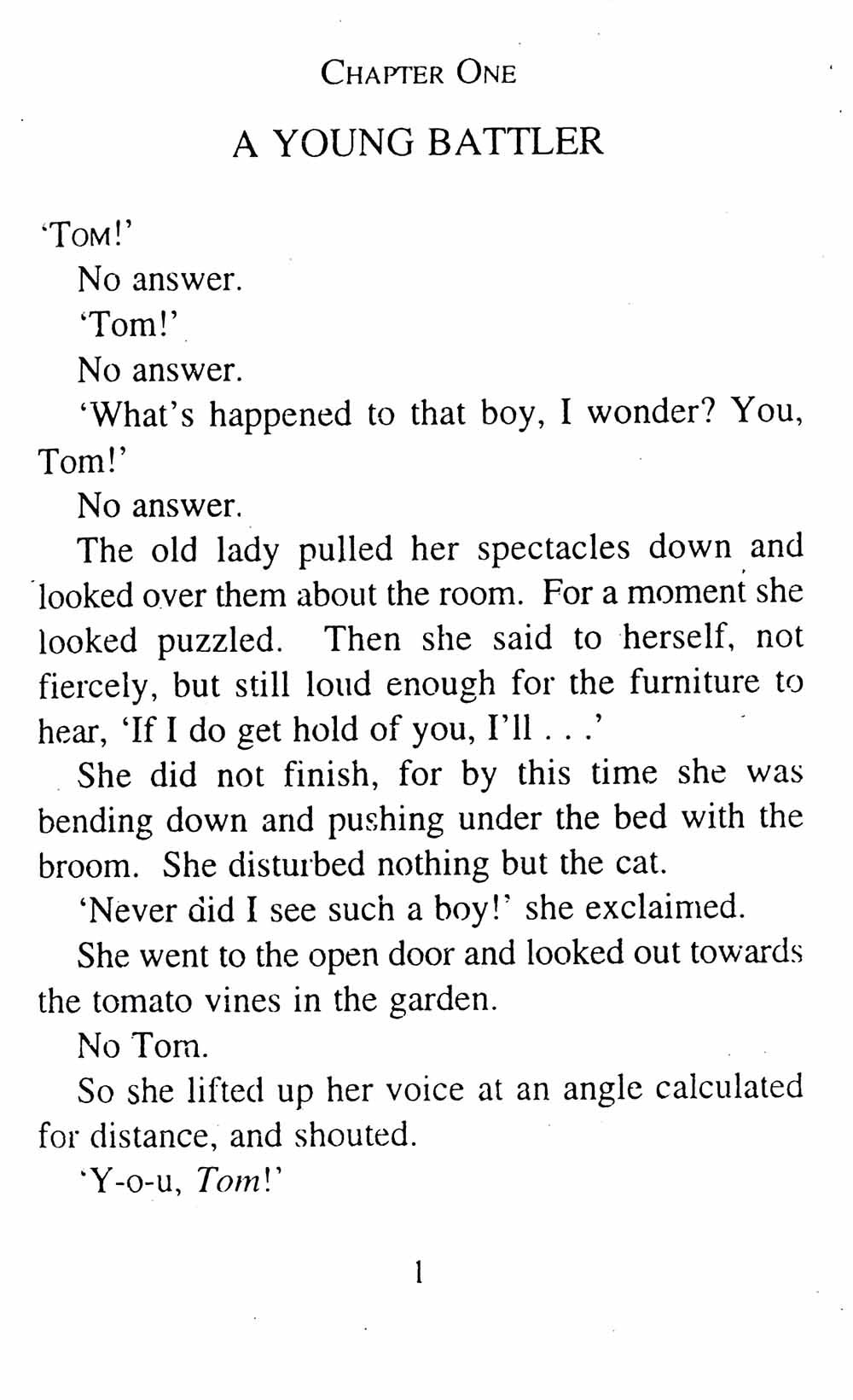 "What's gone with that boy, I wonder? You TOM!" No answer. The old lady pulled her spectacles down and looked over them about the room; then she put them up and looked out under them. She seldom or never looked through them for so small a thing as a boy; they were her state pair, the pride of her heart, and were built for "style," not service—she could have seen through a pair of stove-lids just as well. She looked perplexed for a moment, and then said, not fiercely, but still loud enough for the furniture to hear: "Well, I lay if I get hold of you I'll—"
