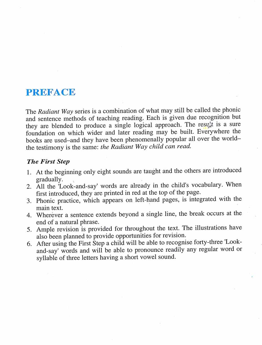 The Radiant Way, a series of four books, written in a novel way to develop in the child a liking towards what he is learning. It has mellowed the various approaches to teaching the English language-speech sounds for proper pronunciation, short sentences to understand language conceptualism through illustrations and exercise. Stories and tales have been elected bearing in mind the child's Very limited vocabulary so as not to irk the student of this level. It is a perfect and steady method of teaching a child by making the subject interesting hence worldwide acceptability of the books.