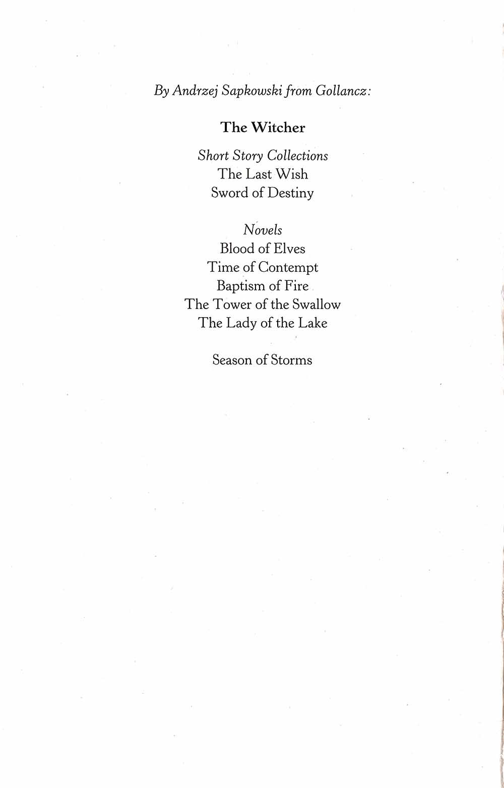 Geralt. The witcher whose mission is to protect ordinary people from the monsters created with magic. A mutant who has the task of killing unnatural beings. He uses a magical sign, potions and the pride of every witcher - two swords, steel and silver. But what would happen if Geralt lost his weapons? Andrzej Sapkowski returns to his phenomenal world of the Witcher in a stand-alone novel where Geralt fights, travels and loves again, Dandelion sings and flies from trouble to trouble, sorcerers are scheming ... and across the whole world clouds are gathering. The season of storms is coming... Translated by David French.