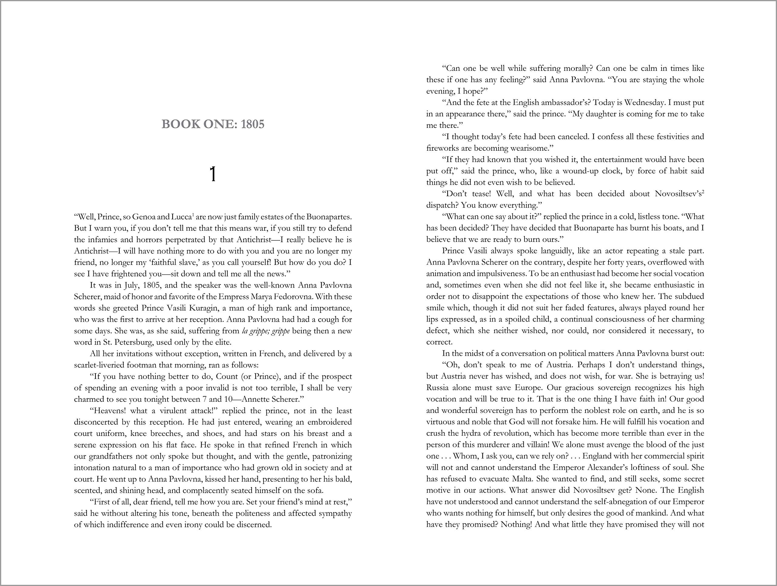 Opening at Anna Pavlovna’s soirée, Tolstoy’s War and Peace introduces you to characters—such as the misfit, illegitimate son Pierre, the analytical and loner Prince Andrew, the sexually alluring Helene and the impulsive and lively Natasha, who plays the pivotal role—whose minds and actions prove to be the laboratory where Tolstoy, with a psychologist’s deftness and an artist’s vision, lays bare the frailties and manias that make up the human psyche.